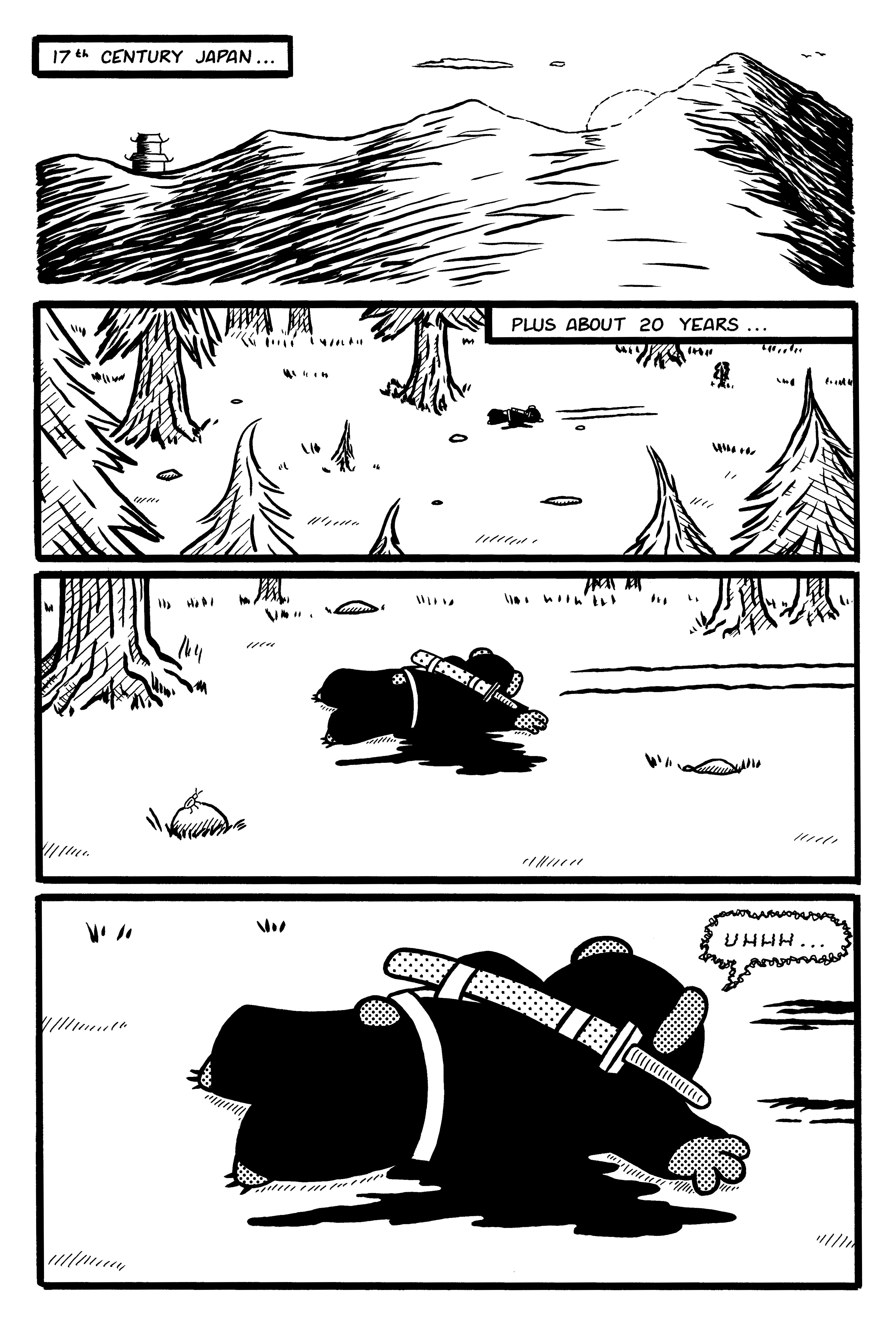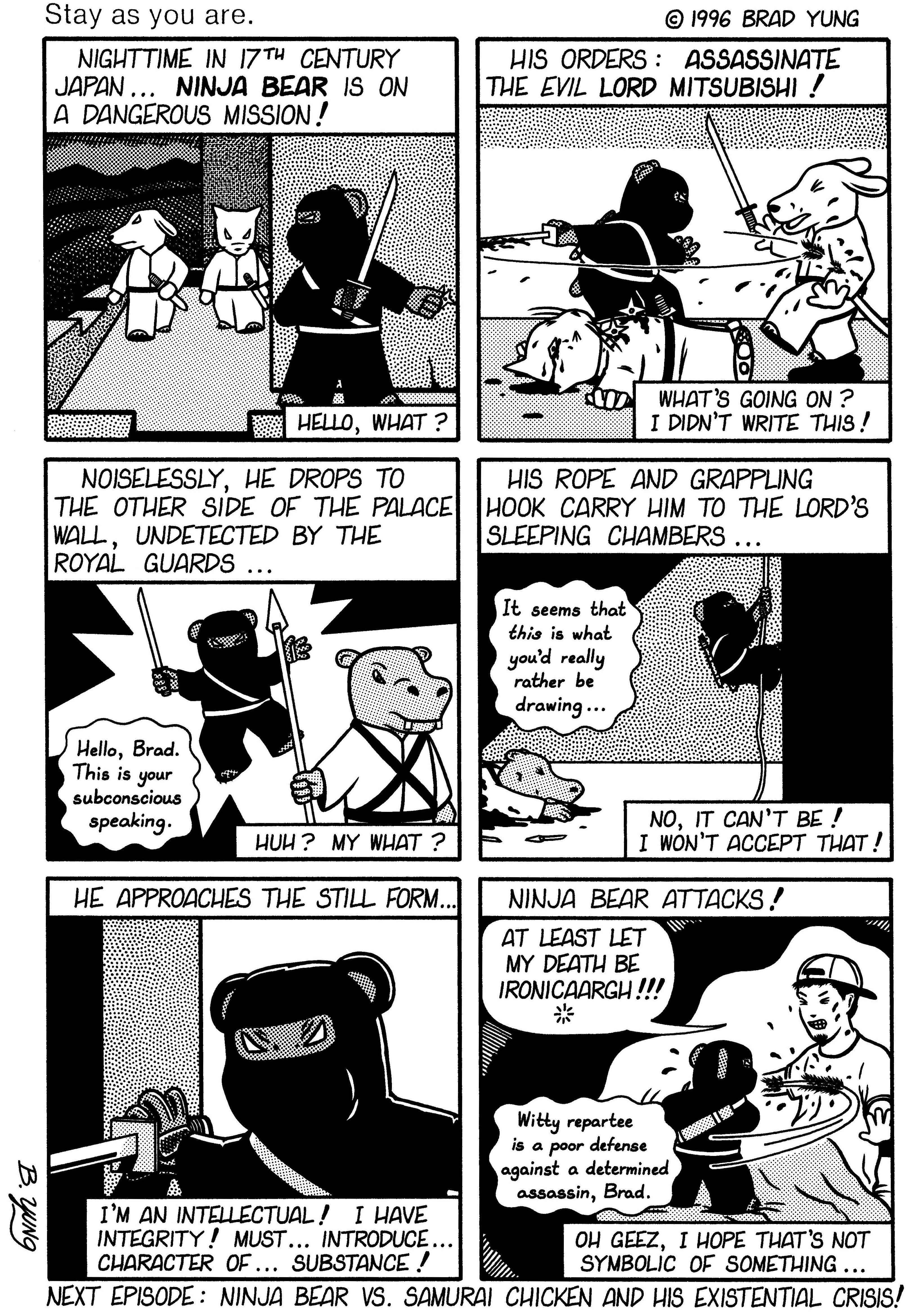Ninja Bear #2 was finished a year later. I had an inkling that I was going to do this for a while, but I wasn't exactly sure what would happen. So, I wrapped up the Stay as you are. storyline, gave Ninja Bear a new friend, introduced a shadowy cabal of mysterious villains whose boss remains unseen, then had Ninja Bear wander around a bit encountering diversions. It's expanding the world a bit while I'm killing time, figuring out where it's all going.